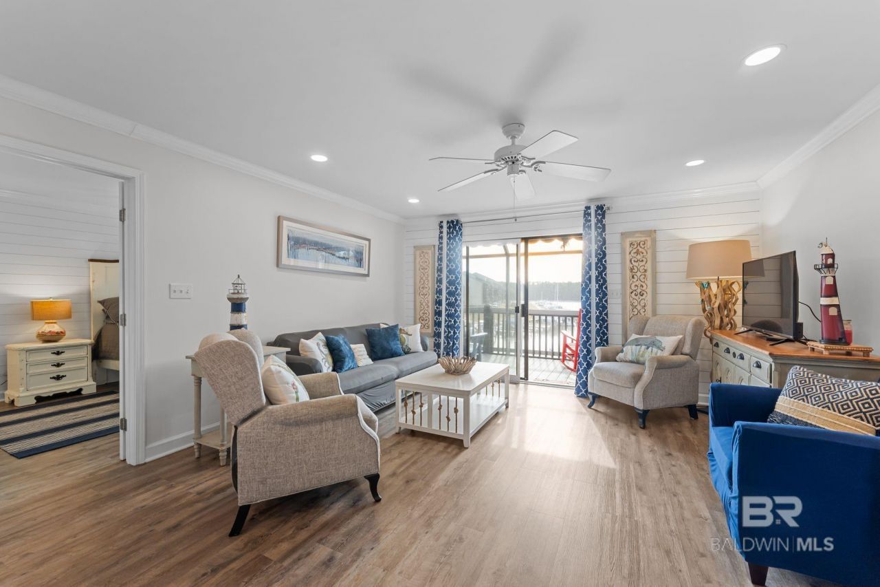 Dock your boat and stay a while! This premier Sailboat Bay residence is a true Boater's Paradise. Welcome to this furnished, top-floor 2-bedroom, 2-bath condo in a well-maintained 6-plex offers the ultimate waterfront coastal lifestyle. Remodeled in 2018, the kitchen features stainless steel appliances, granite countertops, and a classic white subway tile backsplash. Luxury vinyl flooring runs throughout, and both bathrooms have been completely upgraded. Coastal shiplap accents add character to the living room and primary suite. Major updates include a brand-new HVAC system installed in 2025 and PEX water lines in 2018. Step onto the screened-in patio to enjoy sweeping views of the marina and the Intercoastal Waterway, complete with a retractable awning. This unit includes its own private boat slip just outside the building with power, water, and a 10,000-lb boat lift, plus two storage closets?one on the back deck and one on the ground floor. Sailboat Bay is a gated community offering resort-style amenities including two saltwater pools, a kiddie pool and spa, fitness center, clubhouse, tennis courts and boat storage. HOA dues cover water, Wi-Fi, cable, trash, sewer, exterior insurance, and exterior/grounds maintenance for a truly worry-free lifestyle. Located just minutes from prime fishing on Bon Secour River, Bon Secour Bay, and Mobile Bay. Short-term rentals are not permitted. Buyer to verify all information during due diligence.